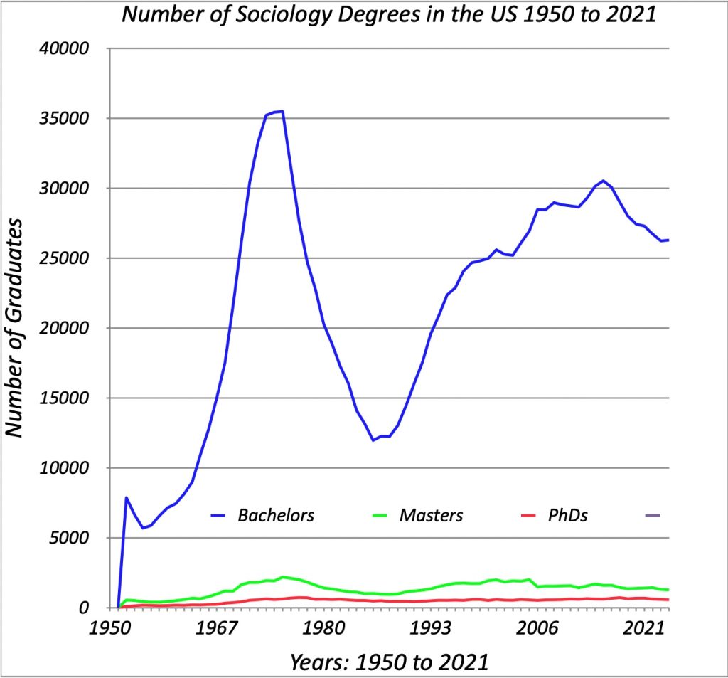 In 2020-2021the number of Sociology Bachelor’s Degrees was 26,291, Master’s Degrees 1,283 and Doctor’s Degrees 573. This downward turn after three decades of growth could reflect different size age cohorts and relative interest in Sociology. Remember that these are raw numbers and not rates. The large peak in the early 1970s is probably a baby-boom effect and the rise around the turn of the century a second wave effect from the baby-boom.